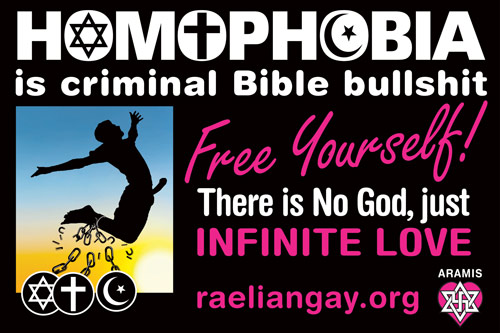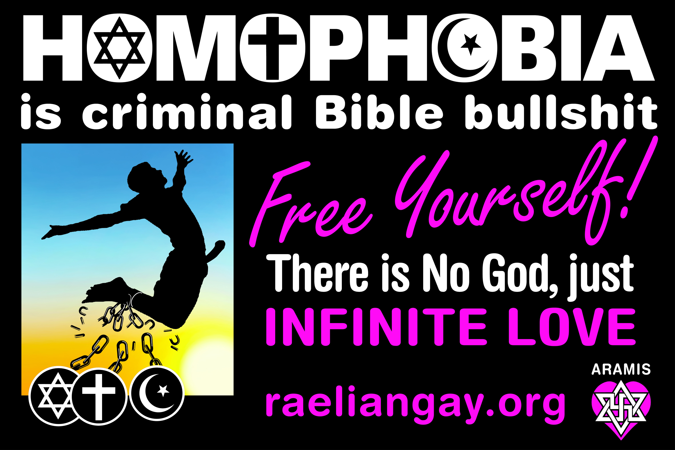 Please help! ARAMIS (the Raelian Association of Sexual Minorities) has put out a call to all who wish to spread our message: HOMOPHOBIA IS CRIMINAL, BIBLE BULLSHIT. Please write to bannedbanner©raeliangay.org or see www.raeliangay.org.